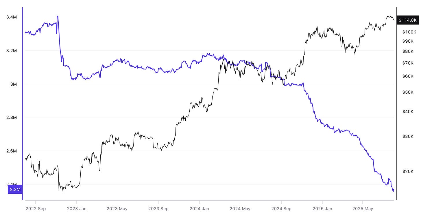 Bitcoin reserves on centralized exchanges have continued their sharp decline, now reaching approximately 2.37 million BTC as of August 1st, 2025—one of the lowest levels recorded in recent years. At the same time, the price of Bitcoin has surged to an all-time high of $114,800, reinforcing the clear inverse correlation between exchange reserves and price.