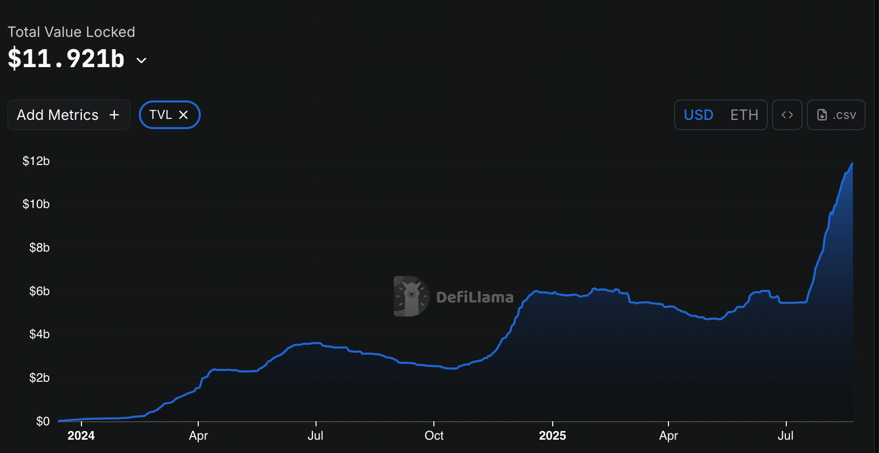Ethena has experienced explosive growth in 2025, with TVL rocketing from around $5B in early 2025 to $11.9B currently, representing a near-doubling in just months. The protocol's synthetic dollar USDe has found genuine DeFi-market fit, evidenced by $1.147B in annualized fees flowing through the system. At $405M in annual earnings with zero incentive spending, Ethena demonstrates that sustainable yield can attract capital without requiring token emissions or artificial subsidies. The dramatic TVL acceleration starting around April 2025 suggests institutional adoption of delta-neutral stablecoin strategies has reached an inflection point.