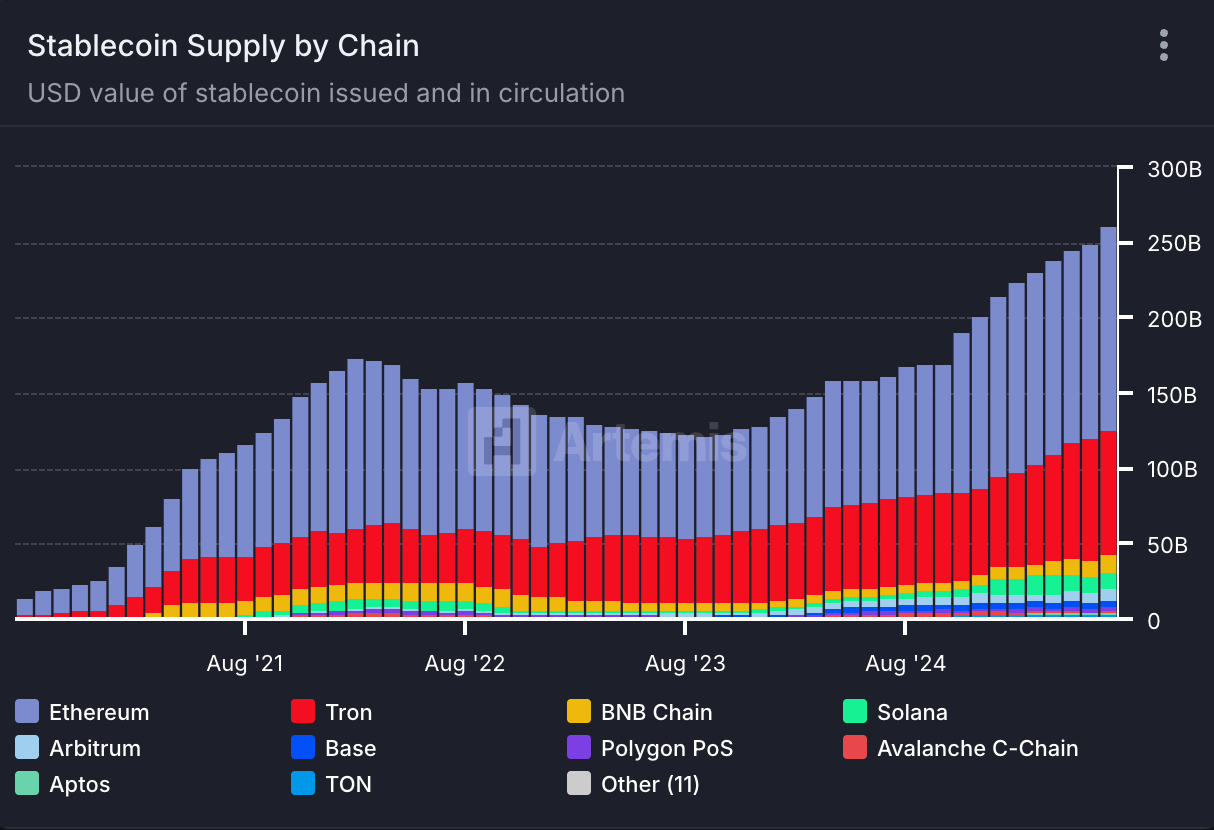 Ethereum continues to dominate the stablecoin landscape with approximately $140 billion in supply, representing over half of the total $270 billion market as of August 2024. The network's stablecoin supply has grown consistently from around $60 billion in August 2021, demonstrating sustained demand for digital dollars on the world's largest smart contract platform. This growth occurred despite increased competition from alternative chains, highlighting Ethereum's sticky network effects and deep DeFi liquidity that keeps institutional and retail users anchored to the ecosystem.