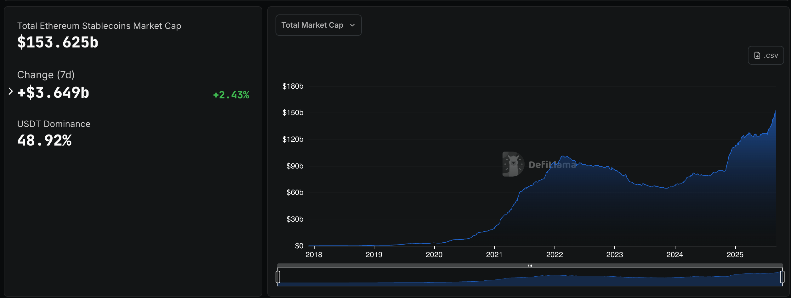 The sustained growth from under $30B in 2020 to today's $153.6B peak reflects institutional adoption moving beyond speculation into genuine economic utility. At this scale, Ethereum stablecoins have achieved the liquidity depth necessary for large institutional operations, creating self-reinforcing network effects where increased adoption drives better liquidity, attracting even more institutional users. The 2.43% weekly growth indicates healthy, sustained demand from businesses using stablecoins for cross-border payments, DeFi protocols, and treasury management—proving that crypto has found its killer app in reimagining how digital dollars move through the global financial system.