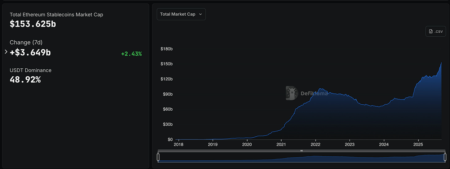 Ethereum Stablecoins Hit $153.6B All-Time High: The Digital Dollar Infrastructure Reaches Maturity