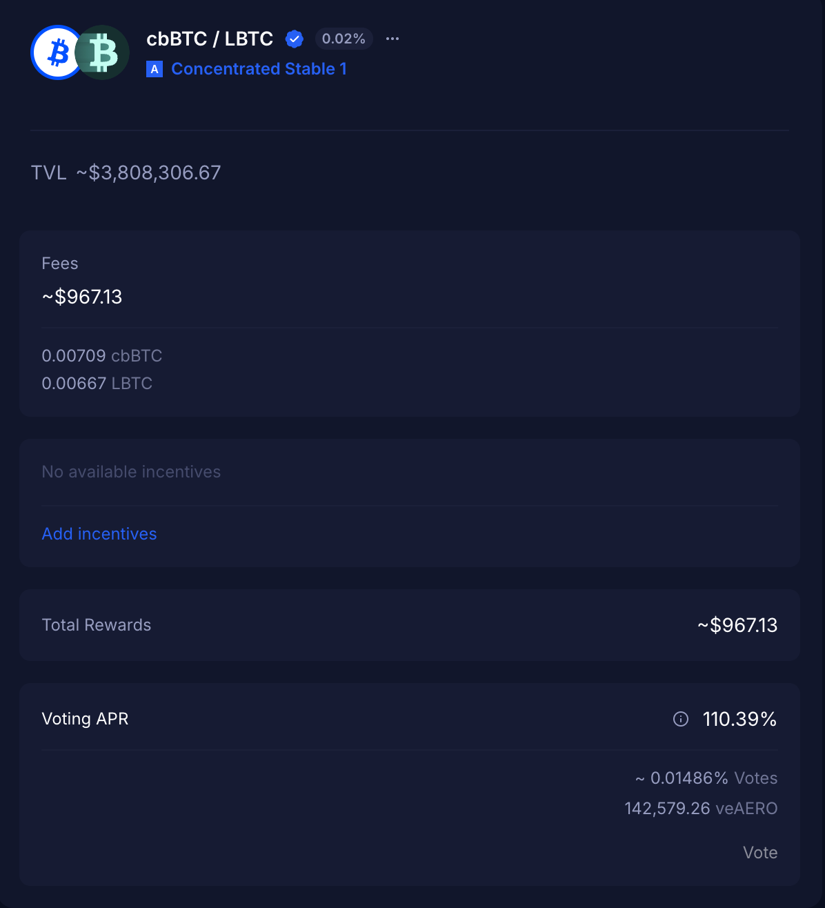 If you’re bullish on both AERO and BTC, this is a great play. I personally locked my AERO for 4 years and keep voting for pools including BTC. This one is particularly attractive because it’s a stable pool (minimal impermanent loss risk since both assets track BTC), and you’re earning the rebase APR, fees, and incentives all at once.