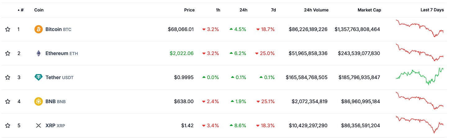 The crypto market faced significant headwinds this week, with most assets experiencing sharp declines. Ethereum broke below the psychologically important $2,000 level, while the top five cryptocurrencies saw average losses of approximately 20% over the past seven days.
