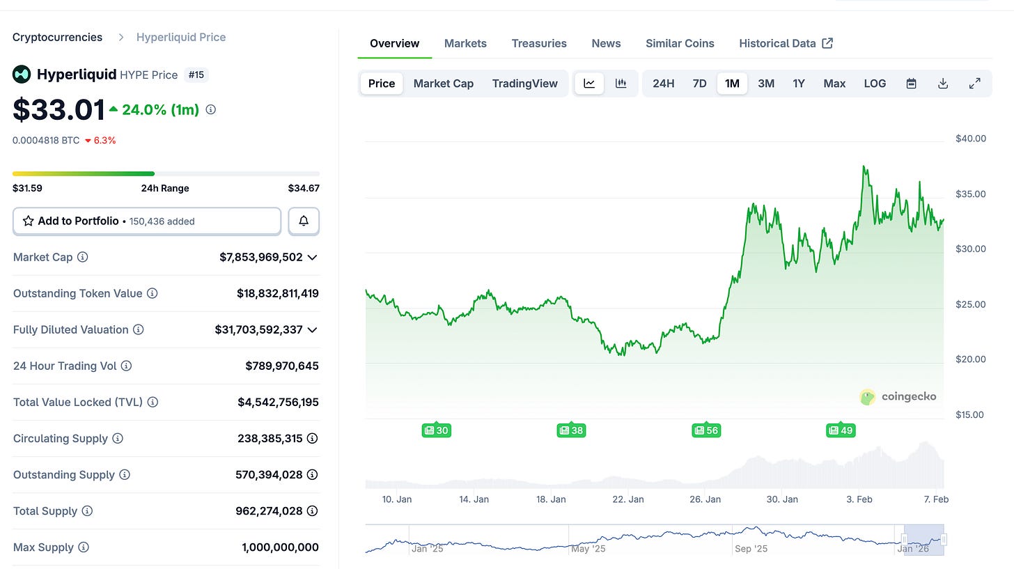 While BTC and ETH have faced significant selling pressure, Hyperliquid (HYPE) has demonstrated clear "risk-off" decoupling, gaining 24% over the last 30 days. This idiosyncratic price action is underpinned by robust protocol fundamentals rather than speculation alone. As a vertically integrated Layer 1, Hyperliquid is capturing an increasing share of the PerpDEX market, recently hitting a record 24-hour volume of $5.45 billion.