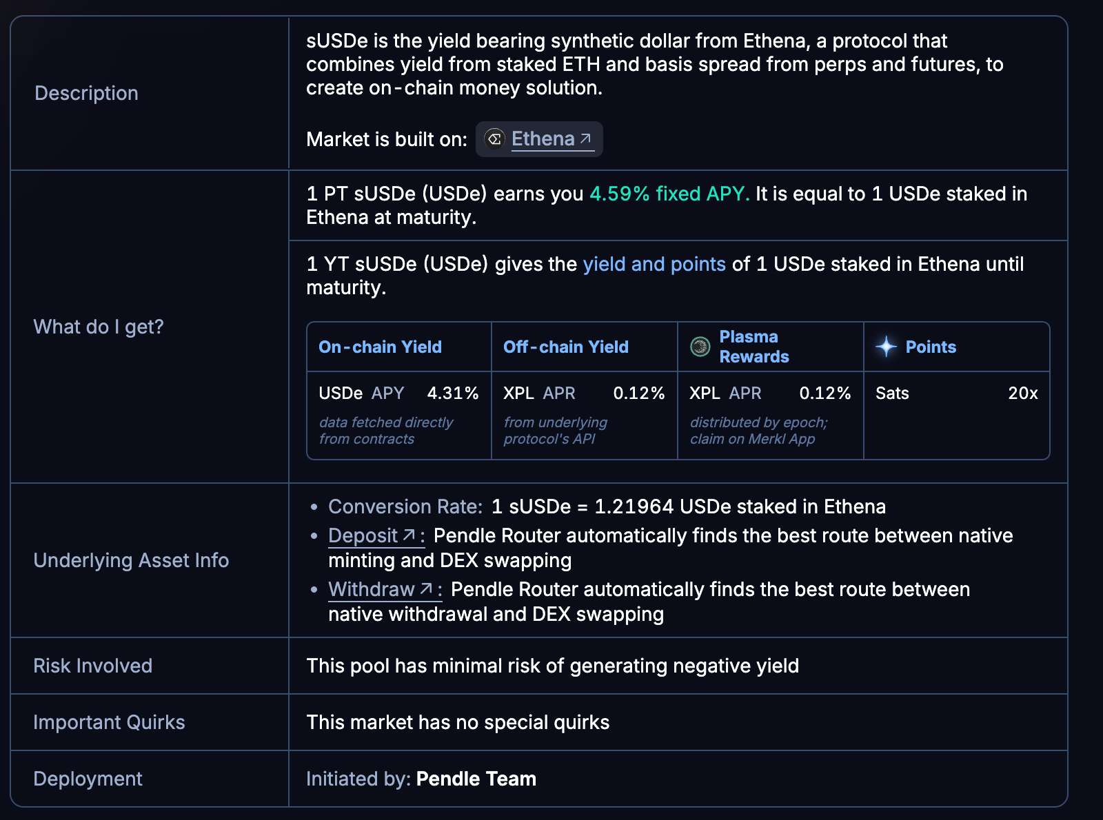 1 PT sUSDe (USDe) earns you 4.59% fixed APY, equal to 1 USDe staked in Ethena at maturity
