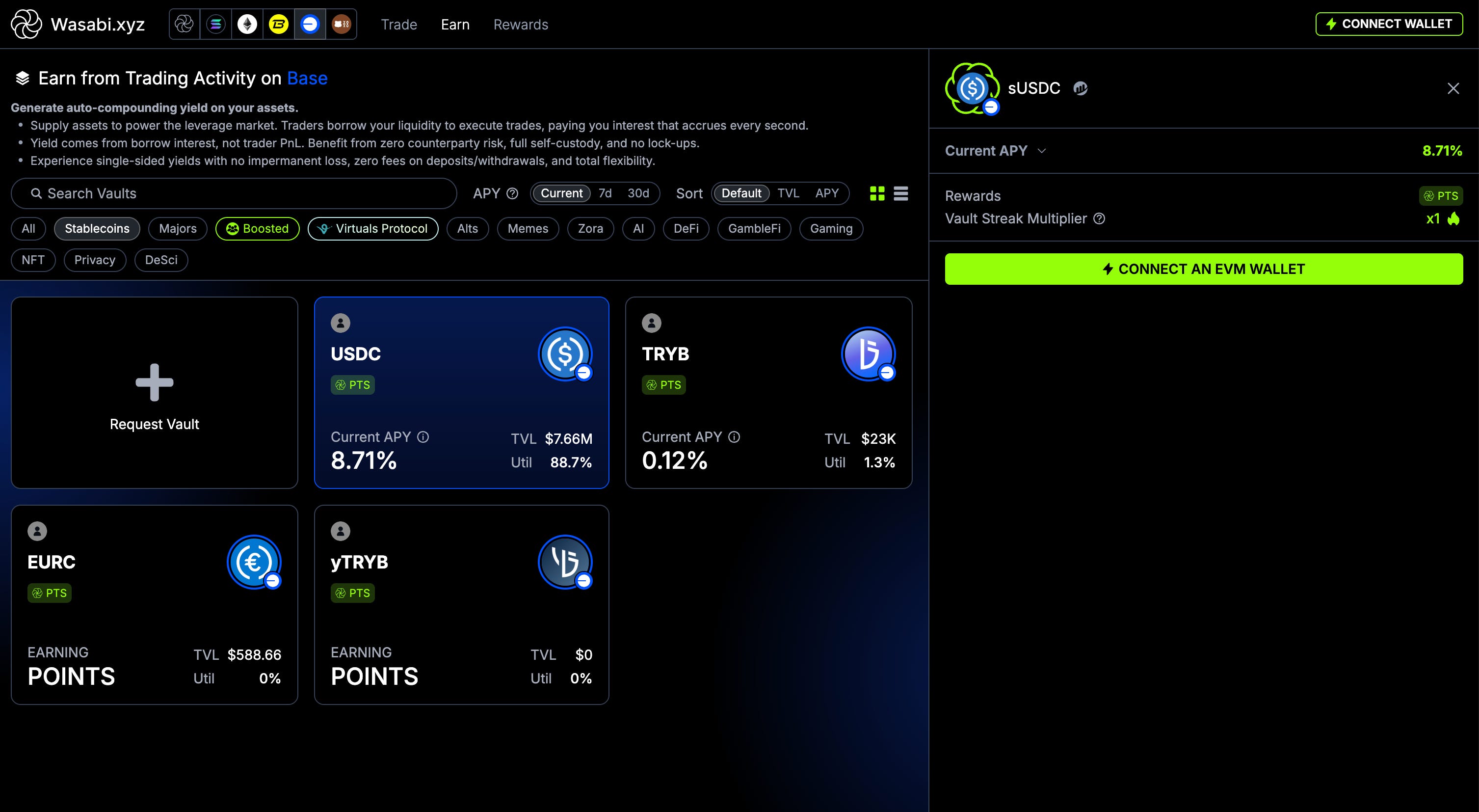 This first strategy is very straightforward. It’s actually a protocol I discovered on the Base app called Wasabi.xyz. You can supply assets to power the leveraged market and generate auto-compounding yield on your assets.